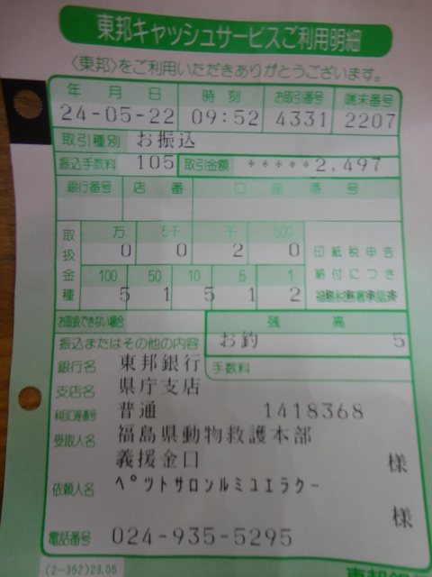 「福島県動物救護本部」さんへ振り込んできました。